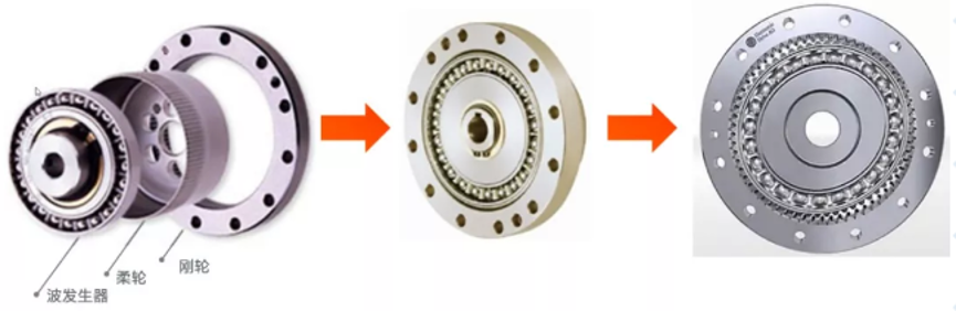 諧波減速機的結(jié)構(gòu)十分簡單,是由波發(fā)生器、柔輪、剛輪三部分組成。其原理是利用柔輪與剛輪的齒數(shù)差,以及柔輪在運行時的可控形變來達到減速與傳遞動力的目的。